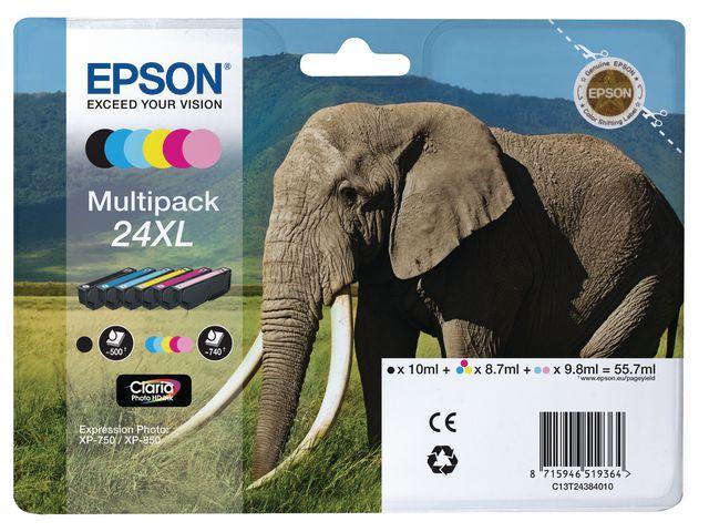 Epson Elephant C13T24384010. Forsyningstype: Multipakke, Udskrivning af farver: Sort, Blå, Lys cyan, Lys magenta, Magenta, Gul, Antal pr. pakke: 1 stk